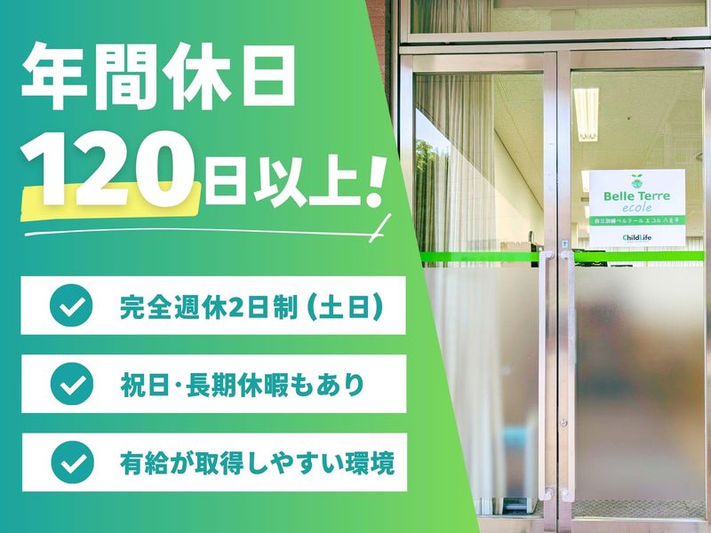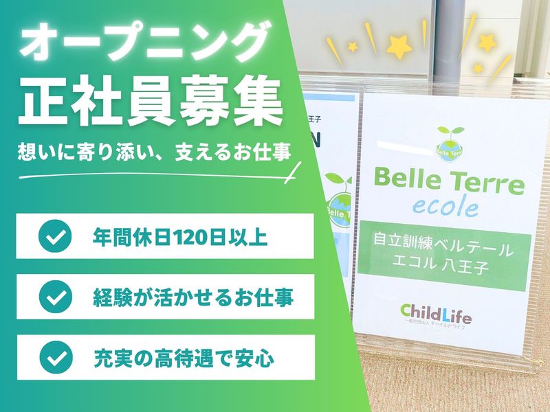 仕事内容 -・-・-・-・-・-・-・-・-・-・-・-・-・-・-・-・- その人の思いに寄り添い、 支えるお仕事。 -・-・-・-・-・-・-・-・-・-・-・-・-・-・-・-・- 利用者様一人ひとりの 「こうなりたい!」思いに寄り添い、 その実現をお手伝いする事業所づくりを 私たちと一緒にしていきませんか? / あなたの経験をぜひ生かしてください! \ . ⭐ この求人のPOINT ⭐  ̄ ̄ ̄ ̄ ̄ ̄ ̄ ̄ ̄ ̄ ̄ ✅オープニングスタッフ募集! ▶綺麗な施設でスタート可能✨ ✅残業はほとんどナシ! ✅年間休日【120日】以上! ▶嬉しい完全土日祝休み♪ ✅資格取得支援制度あり! ▶無資格からでも挑戦できます◎ ✅しっかりした研修があり安心 ▶メンター制度、セミナー無料受講など . <主なお仕事内容>  ̄ ̄ ̄ ̄ ̄ ̄ ̄ ̄ ̄ ■生活リズムの構築や食事・健康管理、 金銭管理など生活能力向上のための 訓練の支援 ■PCトレーニングや面接練習など、 就労に向けての訓練の支援 ■レクリエーションや交流会など、 コミュニケーションに係る活動の支援 ■プログラムやカリキュラムの企画・実施 ■個別支援計画案の作成・実施 ■利用者様のご家族や関係者、 関係支援機関・医療機関との連携など ※仕事内容の変更:なし ※転勤:なし 入職後は、新人研修カリキュラムの受講や 外部講師によるベルテールセミナー (20回/年)もありますので、 安心して働くことができます。 障害者福祉サービス施設 (自立訓練、就労継続支援A・B型、 就労移行支援、相談支援など) での実務経験がある方、 地域の社会資源に詳しい方、 新たな環境でこれまでのキャリアを 生かしたいとお考えの方は大歓迎です! 明るく前向きに業務できる方、ぜひご応募ください。 . <自立(生活)訓練事業所とは>  ̄ ̄ ̄ ̄ ̄ ̄ ̄ ̄ ̄ ̄ ̄ ̄ ̄ ̄ 利用者様一人ひとりが それぞれ思い描く未来に向けて 「自立」できるよう、 事業所が提供する生活能力向上のための訓練や コミュニケーションスキル向上のための トレーニング等の支援を行います。 一人ひとりの思いやニーズを大切にし、 ご家族、関係支援機関、医療機関等との 連携を通じて、その人その人にあった より良い支援を提供していきます。 当法人では 「通所支援ベルテール」の名称で 現在、東京都八王子市で7施設、 千葉県で8施設、山梨県で1施設、 高知県で1施設の合計17施設の 放課後等デイサービスを運営しております。 ベルテールとはフランス語で 「美しい地球」 と言う意味です。 ベルテールを体験したこどもたちが つくっていく、未来の地球を イメージして命名させて頂きました。 . <チャイルドライフの9つの魅力>  ̄ ̄ ̄ ̄ ̄ ̄ ̄ ̄ ̄ ̄ ̄ ̄ ̄ ̄ ̄ ̄ 【 1 】安定した運営 学童保育、サッカーチームなど、 福祉以外の分野でも事業を展開。 【 2 】可能性を広げる活動 子どもの個性を尊重し、 一人ひとりに合わせた支援を行っています。 例:アドバンス型、スポーツ療育型など 【 3 】事務仕事の軽減 請求業務や行政対応などは 本部スタッフが担当。 療育に専念することができます。 【 4 】デジタル化 ・YouTubeによる療育やライブ療育、 代替支援 ・グループウェア導入、業務システムなど 【 5 】充実した教育制度 セミナーを年に10回程度開催し、 外部研修にも積極的に参加。 【 6 】資格取得支援 保育士等の資格取得制度として、 講習費用補助制度があります。 資格取得者にはリカレント休暇を付与! 【 7 】ワークライフバランス ・完全週休2日制! ・残業月平均3時間程度 ・持ち帰り業務もありません。 【 8 】働き方改革 ・有給取得率70%以上 ・時間単位有給あり(2時間単位) ・リフレッシュ休暇制度あり 【 9 】メンタルヘルス 年に1回ストレスチェックを実施。 結果を集団分析し、 職場環境の改善に取り組んでいます。 . <先輩スタッフからの一言>  ̄ ̄ ̄ ̄ ̄ ̄ ̄ ̄ ̄ ̄ ̄ ̄ ̄ ■先輩Aさんより 自分は仕事をしていくうえで 大切なのは、人間関係だと思っています。 チャイルドライフはアットホームで 雰囲気が良く、良い環境なので、 人間関係を気にしている人がいたとしたら 心配なく働けると思いますよ! 一緒に働けることを楽しみにしています! . / ご応募お待ちしております⭐ \