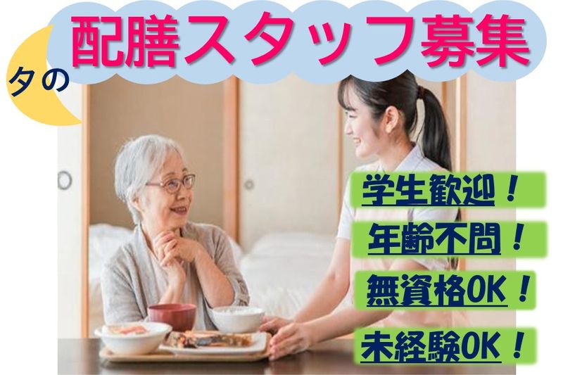 【アピールポイント】 ショートステイでの配膳スタッフを募集します ■学生OK ■年齢不問 ■無資格OK ■未経験OK ■外国人スタッフも活躍できる職場です。