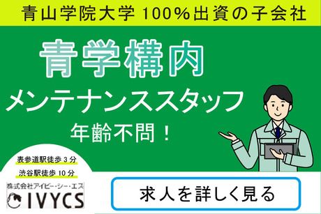 仕事内容 ★ここがポイント★ ー ・大学内のメンテナンススタッフ ・青山学院100%株式出資会社で安定雇用 ・駅チカ好立地 ・年間休日240日以上!休憩・仮眠570分 ・30~50代幅広い世代のスタッフが活躍中 ・年2回の賞与あり ・第二種電気工事士 資格必須 ー 青山学院大学 青山キャンパス内の設備管理業務全般をお任せします! 中央監視システムによる運転監視業務及び 項目に沿った点検・メンテナンスを中心に 不具合の報告や簡単な修繕も行います。 大がかりな工事は専門業者に依頼するため 実務未経験でもすぐに慣れる業務も多いです。 チェックする設備は キャンパス各所の電気・衛生・空調・建築設備など。 監視室での監視業務が主となります。 アイビー・シー・エスの強み 学校法人青山学院100%出資の当社は 創業から90年以上、大学運営を支えてきました。 大学設備は規模が大きく特殊な設備もあり 当社ならではの経験を積めることが魅力です。 DX化に伴い、アプリを用いた新システムを導入 スマホやタブレットでアクセスをしながら 簡易化しておりますので、 未経験の方もご活躍いただけます!