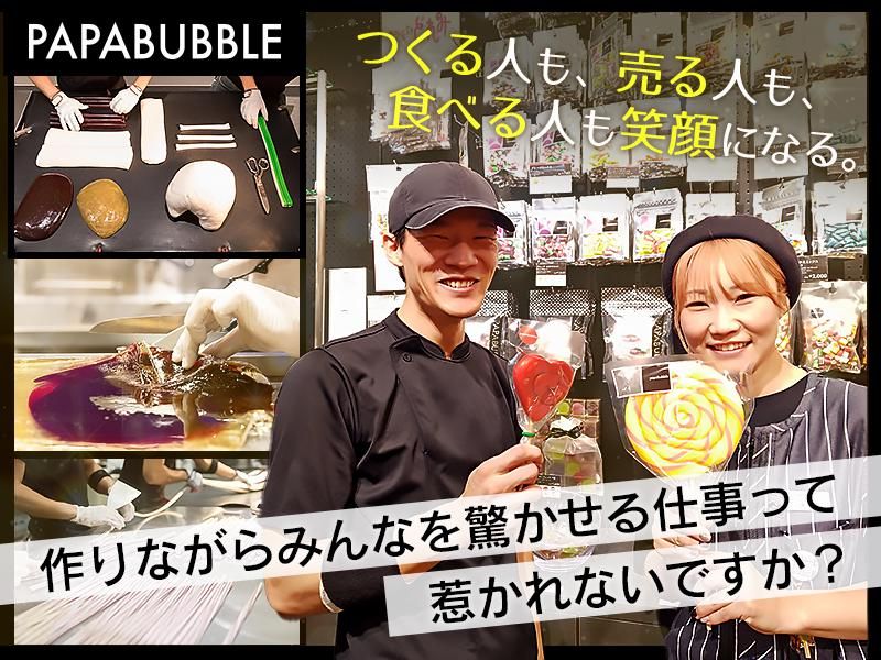 仕事内容 ★調理未経験・未業種の方歓迎★ ★20~30代の男女が活躍中! ★ 【 PAPABUBBLE 】 スペイン・バルセロナ発祥の アートキャンディショップ 全国で22店舗を展開中です! 「世界一面白いお菓子屋さん」 を目指し飴作りを体験できるお店も出店中 【 仕事内容 】 飴作りの作業全般 ・流し込み ・色付け ・カット分け 等 ↓飴づくりの様子はこちらをご覧ください↓ https://youtu.be/1cjO7-iaOwM?feature=shared 教育担当の先輩社員と二人三脚で研修 1つ1つの工程をしっかり教えますので 調理未経験者もご安心ください。 お客さんの前で作業する場合もございます。 ★やりがい 飴を作る中で子供からお年寄りまで様々な お客さんの前で飴を作ります。 緊張することもたくさんありますが お客さんの楽しそうな・おどろいた リアクションはここでしか味わえないお仕事です! キャッチフレーズ 「ワクワクしなくちゃ、お菓子じゃない」 をモットーにキラキラとした宝石のようなキャンディを 一緒に作りましょう♪ 【 勤務地 】 関東のパパブブレ7店舗のいずれか ・中野店 ・羽田空港店 ・横浜アトリエ店 ・大丸東京店 ・さいたま新都心店 ・横浜高島屋店 ・ルミネ有楽町店 希望勤務地につきましては面接時にもお伺いいたします。 【 どんな人が働いているの? 】 飴職人は20代前半から30代のスタッフがメインです。男女比は半々。 前職や出身校もばらばらで、必ずしも製菓学校の出身者や、 パティシェ経験者の方ばかりではありません。 飴作りの工程の中には力が必要な部分もあるので、 元スポーツ選手なども活躍しています。