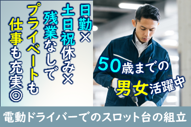 仕事内容 月収23万円以上可能!男女活躍中!未経験者歓迎!外国籍の方も活躍中!お仕事はとても簡単♪土日祝休み&残業もなし!プライベートを大事にしたい方大歓迎です♪ <仕事内容> 分業制にて、スロット台の組立を行っていただきます。 電動ドライバーを使用し、小さなネジで製品を組み立てていきます。 一つの工程は数分で完了してしまう簡単作業です♪ 【お仕事のポイント】 ★短期でも長期でも★ 服装自由で、楽々作業♪ 単純作業なので覚える事は少ないです。 立ち作業でのお仕事です。 個人作業となります。 《環境》 女性が多い職場です。 ロッカー有り アピールポイント <仕事内容> 分業制にて、スロット台の組立を行っていただきます。 電動ドライバーを使用し、小さなネジで製品を組み立てていきます。 一つの工程は数分で完了してしまう簡単作業です♪ 【お仕事のポイント】 ★短期でも長期でも★ 服装自由で、楽々作業♪ 単純作業なので覚える事は少ないです。 立ち作業でのお仕事です。 個人作業となります。 《環境》 女性が多い職場です。 ロッカー有り \充実した福利厚生/ ◎社会保険・雇用保険完備 ◎有給休暇有(6ヶ月経過後、10日付与)※規定あり ◎残業手当 ◎交通費支給(月24000円まで)※規定あり ◎確定拠出年金制度 ◎週払い制度(週3回対応) ◎お友達推薦制度あり(規定有り) ※1名につき3万円~10万円臨時給与として支給 ◎バイク通勤可 ◎食事持参可 ◎ロッカー利用可 ◎福利厚生プログラム (宿泊、グルメ、ショッピングなど大幅割引が受けられる10万アイテムのメニューがあります。)