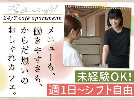 仕事内容 <お任せするお仕事は?> *料理の盛付・トッピング *料理の仕込み *調理補助 など ★まずはできることからでOK。イチから丁寧に教えます!もちろん、困った時はすぐにフォローするので、気軽に相談してくださいね◎ <POINT> ○・。● 24/7 cafe apartment ってどんなお店?○・。● 24hours/7daysいつでも誰でも自分の家のようにくつろげるカフェです。無垢材やリネンを使った、白を基調としたニュートラルな空間で、心も体もリフレッシュできます。 ○・。● SNSでもバズるオシャレメニュー♪○・。● *黒米ブレンドのふっくら玄米に野菜たっぷりの和定食。 *京都宇治藤井茶園の上質なほうじ茶でブレンドしたオリジナルドリンク。 *ちょこっとずつ色んな味を楽しめるデザートプレートや2種のパフェ。 「忙しい毎日に、ちょっぴり丁寧な、至福のごはん」をコンセプトにオシャレなカフェメニューを提供しています。 ○・。● 朝昼夜の好きな時間で週1日~OK!○・。● 働き方はスタッフさんのご希望を考慮して、週1日~OK!時間帯も朝~夜の間でお気軽にご相談くださいね♪ ○・。●得意なことからスタートしよう!○・。● 人と話すことが好き!得意!という人は席のご案内から。 いきなり接客は少し緊張しちゃうという人は簡単な盛付けから。得意なことからスタートOK!無理なく慣れていけます♪ ≪飲食店での経験者大歓迎!≫ カフェ、ファミレス、居酒屋はもちろん、レストラン(和食・イタリアン・フレンチ等)、焼肉店、ラーメン店、ベーカリー、スイーツ店など、前職のお店のジャンルや規模は一切問いません。ホールやキッチンでの基本的な業務経験だけでなく、仕込みや洗い場といった専門ポジション、バリスタやバーテンダー、パティシエといった技術職の経験をお持ちの方も大歓迎です。大手チェーン店で学んだ効率的なオペレーションも、個人経営のお店で身につけた丁寧な仕事も、どちらも貴重なスキルです。ブランクがあっても全く問題ありません。あなたの貴重な経験を、即戦力としてしっかり評価し優遇します!