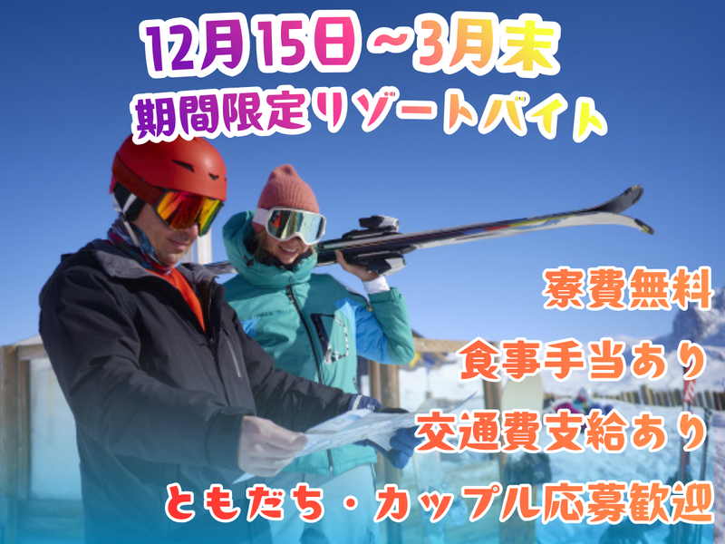 【保険制度】 労災保険 待遇・福利厚生 ※適用されない社会保険がある理由:冬の短期・季節限定契約だから、社会保険の加入は不要です★ 気軽に働けます♪ 【福利厚生】 ・寮費無料(2人1部屋) ・食事手当:勤務日1日1,200円支給 ・赴任手当:期間満了で最大15,000円支給 ・勤務期間は短期・季節限定契約(社会保険不要) ・週2日休みでプライベートも確保 ・未経験でも安心!先輩スタッフのサポートあり ・友達やカップルと一緒に応募OK