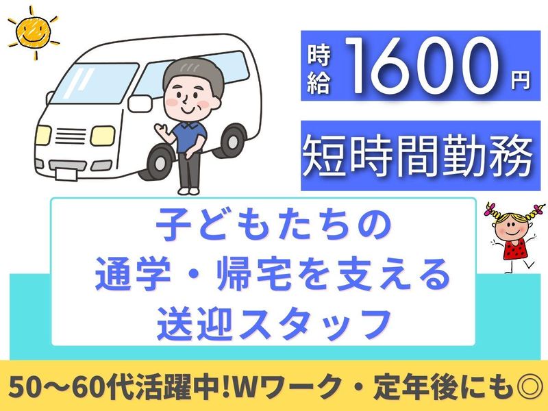 仕事内容 【POINT✨】 ✅ 短期も相談OK ✅ 短時間勤務 ✅ 選べる時間 ✅ 週2日~OK ✅ 高時給★時給1600円 ✅ 中高年/50~60代活躍中 ✅ 定年退職後にも最適 ✅ WワークOK 【仕事内容】 放課後等デイサービスを利用する 子どもたちを学校やご自宅まで 送迎するお仕事です。 決まったルートでの送迎が中心なので、 道を覚えればスムーズに運転できます。 子どもたちの乗り降りの際も、 スタッフがサポートするため安心です。 【具体的には】 ◎ 学校から施設までの送迎 ◎ 施設からご自宅までの送迎 ◎ 送迎前後の車両チェック・簡単な清掃 \ こんな方におすすめ / ・定年後も無理なく働きたい方 ・夕方の空き時間を有効活用したい方 ・短時間で効率よく収入を得たい方 ・運転が好きで、安全運転に自信のある方 ・落ち着いた環境で 人の役に立つ仕事がしたい方 ・Wワークや副業をお探しの方 【放課後等デイサービスとは】 障がいのあるお子さん (主に小学生~高校生)を対象に、 放課後や長期休暇中に 安心して過ごせる居場所を提供する 福祉サービスです。 送迎ドライバーは、 子どもたちの「安全な移動」 を支える大切な役割です。