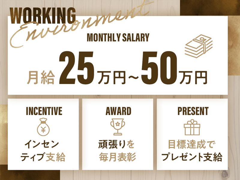求めている人材 \経験・スキル、一切不問!/ 応募に必要なのは【普通自動車免許(AT限定可)】だけ! 学歴・経歴も関係なし。 未経験・第二新卒・ブランクのある方も大歓迎です◎ 「正社員デビューしたい」 「新しいことに挑戦したい」 「将来のために今しっかり稼ぎたい」 そんな想いがあれば、ぜひご応募ください! 【応募条件】 □ 普通自動車運転免許(AT限定可) それだけでOK!特別な資格や経験は一切必要ありません。 【こんな方にピッタリです】 ◆未経験から営業職にチャレンジしたい ◆自分の力でしっかり稼ぎたい ◆趣味やライフスタイルを大切にしたい ◆接客や人と話すことが好き ◆安定した環境でキャリアを築きたい ◆若いうちにチャンスをつかみたい 1つでも当てはまる方は、ぜひご応募ください! 【まずは話を聞いてみるだけでもOK!】 「ちょっと気になる」 「詳しく話を聞いてから決めたい」 そんな方も大歓迎!カジュアル面談も実施しています。 将来のこと、働き方のこと、不安に思っていることなど、ざっくばらんにお話ししましょう♪