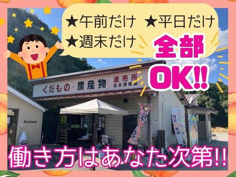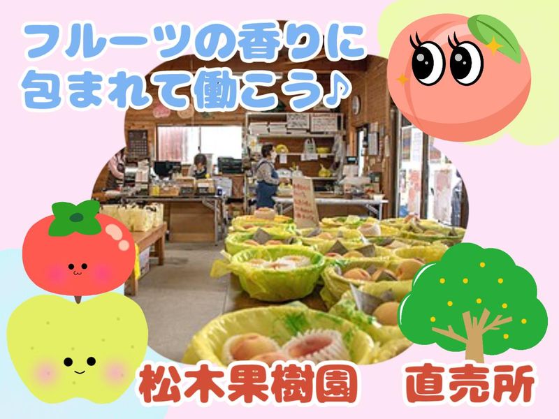 仕事内容 ✨✨✨✨✨✨✨✨✨✨✨✨✨✨ \\ 土日祝に働ける方、大歓迎! // 日・祝は【時給100円UP】 週3日・1日4時間~OK/シフト相談可 ✨✨✨✨✨✨✨✨✨✨✨✨✨✨ フルーツ直売所での販売・接客・レジ・商品陳列などをお願いします。 わが子のように大切に育てた果物や、手作りジャムをお客様にお届けするお仕事です♪ 「この前のいちご、美味しかったよ~!」なんて声をかけてもらえることも。 お客様とのやりとりがうれしい、あったかい職場です✨ 《松木果樹園で働くおすすめポイント》 ✅土日祝に入れる方は特に歓迎! ・日曜・祝日は【時給100円UP】 ・Wワーク、学生さんの空いた時間にも◎ ✅シフト柔軟!週3日~・1日4h~OK ・午前だけ/午後だけ/土日メイン など ライフスタイルに合わせて働けます ※フルタイム希望の方も大歓迎! ✅学生さん~主婦(夫)さんまで幅広く活躍中 初バイト・ブランクがある方も安心して始められます◎ お子さんの学校行事や急なお休みも、「お互いさま」の気持ちでカバーし合っています◎ ✅旬のフルーツが社割でお得にGET! 家族にちょっとしたおみやげ感覚で買えるのも人気の理由♪ ✅ 自然に囲まれた、気持ちのいい職場 屋外の開放感ある環境で、 リフレッシュしながらお仕事できます✨ ✅ スタッフ同士の雰囲気がとても良い! 「ありがとう」「助かりました」 そんな言葉が自然に飛び交う職場です。 ⭐SNSもやってます⭐ フルッターレや果樹園の魅力をたっぷり載せていますので、ぜひチェックしてみてください♪ インスタグラム matsukikazyuen https://www.instagram.com/matsukikazyuen/