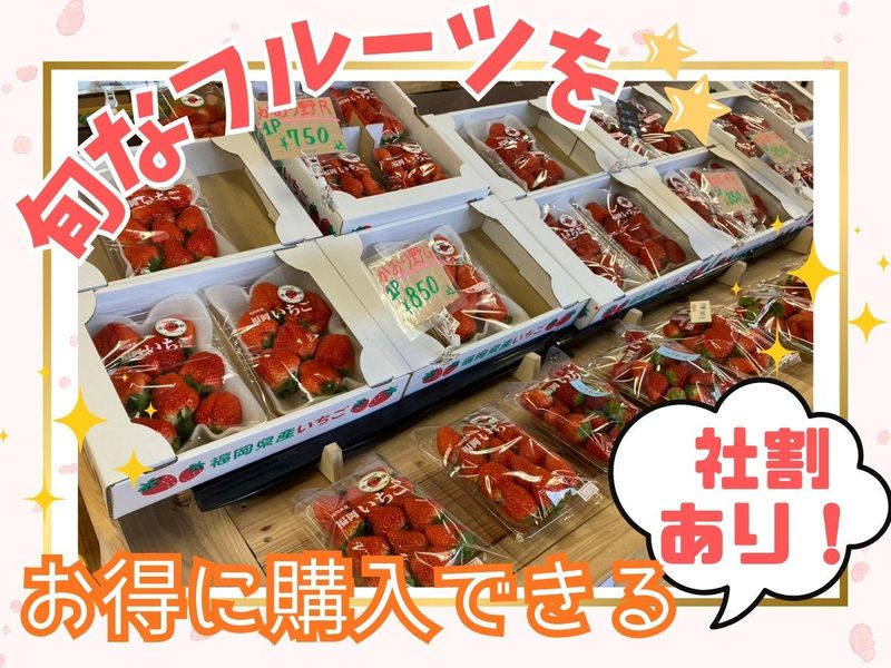 【保険制度】 雇用保険、労災保険、健康保険、厚生年金 待遇・福利厚生 【福利厚生】 ◇社会保険(法定) ◇交通費規定支給 ◇おいしい果物などの社割あり ➡大人気です!とっても美味しいので、 ぜひ利用して下さい♪ ◇エプロン支給(服装は自由です) ◇髪型・髪色・ネイルOK(華美でなければ)