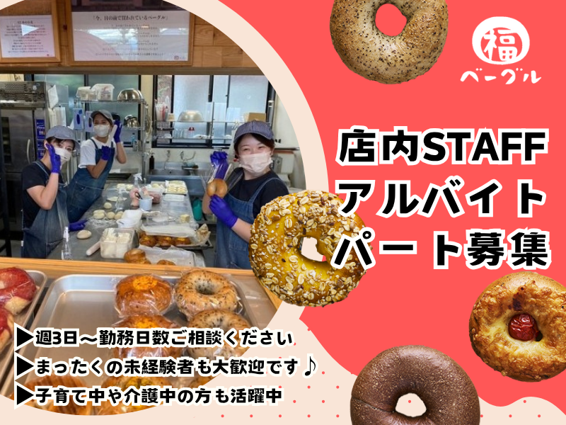 仕事内容 ✤*✤*✤*✤*✤*✤*✤*✤*✤ ベーグル専門店で ✤ベーグル作り ✤販売 ✤接客 をお願いします。 ✤*✤*✤*✤*✤*✤*✤*✤*✤ ベーグルつくり ・当日販売するベーグル作り 生地の仕込みや成形、 ケトリングから焼成まで いろいろな工程を 他スタッフと協力しながら 行います。 ・ベーグルの袋詰め ・当日焼きのベーグルを バーガー袋に包む作業 接客・販売 ・お客様への接客・販売 ・レジ業務 ・商品陳列 ※⏰5:00~8:00は ベーグル作りのみの お仕事になります ✤*✤*✤*✤*✤*✤*✤*✤*✤ 9割以上のスタッフが 未経験スタート✨ ┈┈┈┈┈┈┈┈┈┈┈・୨୧ 自分たちも未経験から 始めてるからこそ ”わからないことがわかる” ので丁寧なサポートが できます! 社割販売あり✨ ┈┈┈┈┈┈┈┈┈┈┈・୨୧ 毎日1個お好きなベーグル のまかないや社割販売も あります! 常に最新のシステムを 導入して、スタッフの 働きやすさUPに 努めています✨ ┈┈┈┈┈┈┈┈┈┈┈・୨୧ 自動釣銭システムや スタッフの勤怠を スマホのアプリ管理にする など、スタッフが 働きやすい環境作りを 目指しています。 ライフステージに応じて 働き続けられる✨ ┈┈┈┈┈┈┈┈┈┈┈・୨୧ 働くママさんや ご家族の介護をされている方 が多く在籍している為、 お互いの状況を 理解しサポートし合いながら 働いています。 出産などで退職後も 戻ってくるスタッフ多数✨ ┈┈┈┈┈┈┈┈┈┈┈・୨୧ お子様の出産や 子育てで一度離職されても、 戻ってくるスタッフが 多数おります。