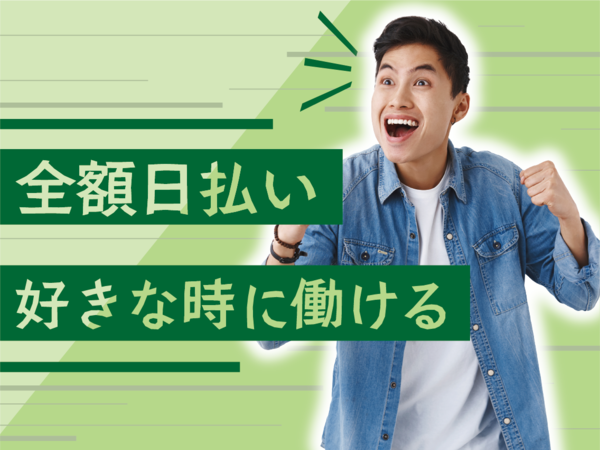 【保険制度】 雇用保険、労災保険、健康保険、厚生年金 待遇・福利厚生 ●急な出費も安心! 「全額日払い制」 →勤務後、当日に現金手渡し! ★友達と食事!デート!レジャー!など 遊び予定に合わせて働いて現金をゲットできます! ●経験や資格に応じて日給アップ! ●残業時は別途、残業手当を支給 【特別入社手当】 ・作業用品プレゼント ・寮費1ヶ月無料 ※すべて当社規定により支給。 加入保険 健康保険あり・厚生年金あり・雇用保険あり・労災保険あり