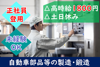 仕事内容 【高時給】★市街地からほど近い立地で楽々アクセス★大手企業の派遣先正社員になるチャンスです! <仕事内容> 【未経験OK】フォークリフト資格保有者歓迎◎ 自動車部品の製造(鍛造)に関する各種作業です☆ プレス:熱間鍛造・冷鍛鍛造設備のオペレーター(手動・自動)等 熱処理:鍛造品の熱処理オペレーター、リフト作業 検査:鍛造品のショットブラスト、検査、リフト作業 集出荷作業:最終検査、リフト作業 単純作業の繰り返しではないのでやりがい抜群です!! ライン作業です。 立ち作業になります。 重量物を扱う(15㎏以上)こともあります。 グループ作業になります。 《職場環境》 男性が多い職場です。 冷暖房完備♪ ロッカー有り|シャワールーム有り|休憩室完備 アピールポイント <仕事内容> 【未経験OK】フォークリフト資格保有者歓迎◎ 自動車部品の製造(鍛造)に関する各種作業です☆ プレス:熱間鍛造・冷鍛鍛造設備のオペレーター(手動・自動)等 熱処理:鍛造品の熱処理オペレーター、リフト作業 検査:鍛造品のショットブラスト、検査、リフト作業 集出荷作業:最終検査、リフト作業 単純作業の繰り返しではないのでやりがい抜群です!! ライン作業です。 立ち作業になります。 重量物を扱う(15㎏以上)こともあります。 グループ作業になります。 《職場環境》 男性が多い職場です。 冷暖房完備♪ ロッカー有り|シャワールーム有り|休憩室完備 \充実した福利厚生/ ◎社会保険・雇用保険完備 ◎有給休暇有(6ヶ月経過後、10日付与)※規定あり ◎残業手当 ◎交通費支給(規定内) ◎確定拠出年金制度 ◎週払い制度(週3回対応) ◎お友達推薦制度あり(規定有り) ※1名につき3万円~10万円臨時給与として支給 ◎車(マイカー)・バイク・自転車通勤可(無料駐車場あり) ◎無料送迎バスあり ◎制服貸与 ◎冷暖房完備 ◎食堂有り(夜勤でも利用できます) ◎ロッカー・休憩室利用可 ◎シャワールームあり ◎社員登用制度あり ◎福利厚生プログラム (宿泊、グルメ、ショッピングなど大幅割引が受けられる10万アイテムのメニューがあります。) ・就業上の悩みなどを外部機関にLINEなどのSNSを使って相談できる仕組みがあるから安心です!