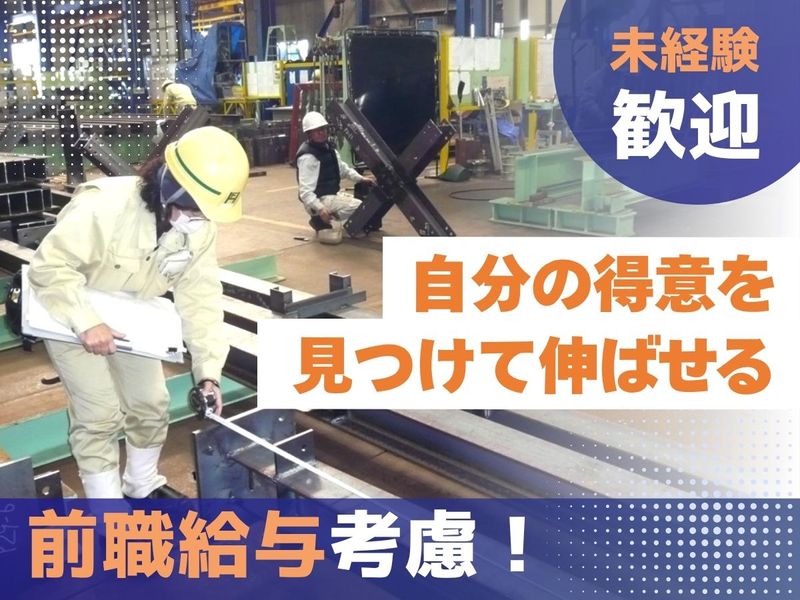 仕事内容 // 鉄骨製品の工場作業スタッフ! ⭐前職給与考慮 ⭐未経験OK!土日祝休み ⭐車、バイク通勤OK ⭐得意が見つかり手に職がつく \\ 工場作業員として、製造現場の幅広い工程を経験しながら、あなたの適性に合わせてスキルを伸ばしていくポジションです! 最初は「工具や部材の名前を覚える」「図面の見方を学ぶ」「先輩の作業補助」といった、簡単な作業からのスタートでOK。 できる業務、興味ある業務から取り組んで、あなたの得意を見つけ、伸ばしていきましょう。 ⭐選べる&伸ばせる業務内容 ━━━━━━━━━━━━━━ ✅組立 鉄骨製品を組み上げる作業。図面を見ながら、部材を並べたり、仮止めしたりする工程から始めます。ものづくりの面白さを味わえます。 ・図面を見て部材の配置 ・半自動溶接の補助 ・加工機へのセット作業 など ✅機械加工 鉄骨を「切る」「穴を開ける」など、専用の加工機を操作します。機械のボタン操作が中心なので未経験でも安心。コツコツもくもく進める仕事です。 ・加工データの入力 ・鉄骨のセット ・穴あけ機・バンドソー操作 など ✅溶接 高層ビルや駅舎、商業施設の“骨組み”となる鉄骨を溶接します。加工機やクレーンの操作もあり資格取得可能◎ ・図面をもとに部材の配置・仮組み ・鉄骨溶接(半自動溶接/アーク溶接) ・仕上げ加工(バリ取り・検査) ✅品質管理 モノづくりの最終工程。完成品を測定し、品質を確認します。安心・安全な製品を届ける上で要となる仕事です。 ・検査・測定 ・報告書の作成 ・工程管理の補助 ⭐入社後のサポート体制 ━━━━━━━━━━━━━━ 工場勤務未経験の先輩も多数活躍中!工具の使い方から図面の読み方、機械操作、品質チェックまでイチから育てるノウハウがあります。半年〜1年で、できることが確実に増える環境です。 ◎先輩がマンツーマンで指導 ◎まずは軽作業から始められる ◎失敗しても先輩がフォロー ◎資格取得の支援あり “なんとなくモノづくりが気になる”くらいの気持ちからチャレンジできるので、ご安心ください。 ⭐安定×成長の充実環境 ━━━━━━━━━━━━━━ ◤幅広い工程で“得意”を伸ばせる◢ 組立・製造・溶接・品質管理など、モノづくりの多様な工程を経験できるため、適性に合わせて成長できます。 ひとつの仕事に固定せず、できることから挑戦 → 得意を伸ばすというキャリアを積めます。 ◤社会インフラを支えるものづくり◢ 製造しているのは、大型商業施設、公共施設、駅舎などの建物の“骨”となる鉄骨製品。 自分が関わった製品が街の景色や大型施設として形に残るので、社会貢献性が高く、やりがいを実感しやすい仕事です。 ◤安定基盤 × 働きやすい職場◢ 大手企業との取引やインフラ関連の案件が多く、仕事量が安定しています。 車・バイク通勤OK、土日祝休みなど、プライベートも大切にできる環境。地域に密着しながら腰を据えて働きたい方に最適です。
