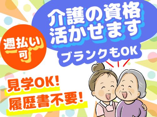 仕事内容 【夜勤が出来ない方は相談OK!】 家庭や子育てと両立しながら働きたい 主婦(夫)さんにもおすすめの介護職! 初心者研修または介護福祉士の資格を活かせる! 完全週休二日制でしっかり休めます! 【履歴書不要でラクラク応募!】 書類準備の手間がなく、 すぐにお仕事のご案内が可能です! 「ちょっと気になる」だけでもOK! お気軽にご応募ください! 【介護スタッフのお仕事内容】 ・高齢者の利用者様の介護業務全般 (食事介助、入浴介助、排せつ介助など) ・介護記録作成 (パソコンを使用します) 【完全週休二日制でしっかり休める!】 入社から半年後には有給休暇も利用可能。 夜勤帯の勤務もありますが、 夜勤が出来ない方は個別にご相談ください! 【新しい職場が不安、、そんな方もご安心ください!】 独り立ちするまで先輩社員が丁寧に 指導するところもお勧めポイントです! 家族の介護や看護、子供の学校行事など 急な予定変更やお休みにも周囲の職員が 協力し合う、アットホームな職場です。 ほぼユニット式ですが、 ユニット毎にご飯を炊いたり、 みそ汁を作ったりなどもありません。 ブランクがある方や 経験が浅い方もぜひご応募ください! 若手から中高年世代まで 幅広い年代が活躍しています。 資格ない方もご相談ください! 【こんな方におすすめ!】 ・介護の資格を活かしたい ・できれば日勤帯だけ働きたい ・家庭と両立しながら働きたい主婦(夫)さん 【週払い制度あり】 お財布がピンチな時に助かる 週払い制度!※規定あり 働いた分のお給料を早くもらえるのも 嬉しいポイントです! 【現場の見学あり】 介護専門のアドバイザーが 現場の見学面接同行しますので、 安心してご相談ください。 但し現在コロナウイルスの影響で 見学ができない場合も ございますのでご了承ください。