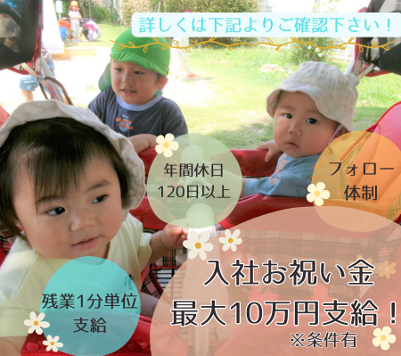 【入社お祝い金最大10万円】入社時期相談可能!保育士資格を活かせるお仕事♪年間休日122日以上でプライベートも充実♪