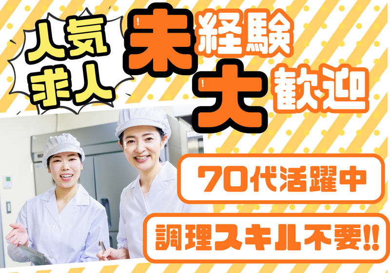 仕事内容 / ✨未経験大歓迎!✨ 60食分を”温めて盛り付けるだけ!!” 簡単調理のお仕事です!! \ ✅湯せんができれば活躍できる! シンプルな調理♬ ✅パートスタッフ平均年齢73歳! ✅無資格・未経験でも十分活躍できます 体力仕事少なめ◎ 覚えることも少ないから、すぐに慣れます♪ .+*・*☆・.+*+――――――――――――― 【具体的な仕事内容】 [1]冷凍・チルドのパック料理を スチーマーや湯せんで温める ※食材を切るときだけ包丁を使用 さらに細かい作業はミキサー使用OK! [2]温めた料理をお皿に盛り付け、配膳車へ [3]配膳車をエレベーターに乗せたら作業終了! →あとは職員にバトンタッチ♪ ※60食程度を2~3名体制で対応! ※施設利用者様との接触なし。 調理場だけでコツコツ作業♪ ―――――――――――――.+*・*☆・.+*+ ⭐ココがポイント!!⭐ 未経験でも安心して始められるのが、 このお仕事の魅力です!! 男女50代~70代のスタッフが活躍中! パート未経験からスタートした方ばかり。 複数名で協力するので、焦らず作業でき、 仕事内容もシンプルですぐ覚えられます。 施設の直接雇用で安定して 長く働けるのも嬉しいポイント。 早朝だけの短時間勤務もできるので、 家事や趣味との両立も無理なく可能です。