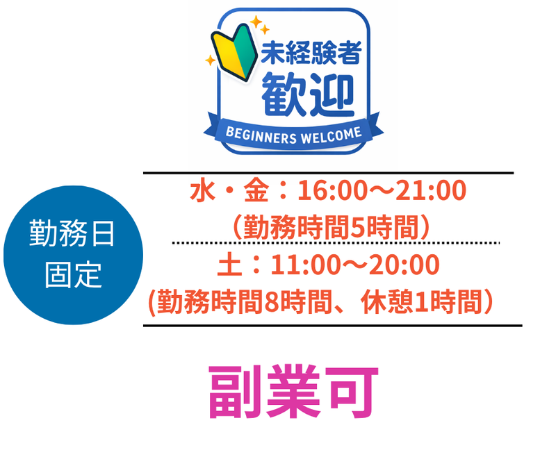 時間・勤務日詳細 勤務スケジュール: 水曜日、金曜日:16:00~21:00 (勤務時間5時間) 土曜日:11:00~20:00 (勤務時間8時間、休憩1時間)