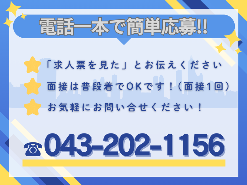 仕事内容 。・⁺⁺・。・⁺⁺・ 。・⁺⁺・ 。・⁺⁺・。 ☕未経験スタート歓迎! ☕日中は自由時間♪ ☕長期ブランクある方も歓迎! ☕入社後の紹介制度で手当GET! ☕副業・WワークOK! ゜・₊₊・゜・₊₊・ ゜・₊₊・ ゜・₊₊・゜ ┏━━━━━━━━━━━━━━━━┓ ⭐家事の延長でできる清掃スタッフ⭐ ┗━━━━━━━━━━━━━━━━┛ ⏩駅チカの複合施設で清掃のお仕事。 <お任せするのは> ❐掃除機掛け ❐拭き掃き ❐トイレ清掃 など ☘使うものはモップや掃除機などの 身近な道具ばかりなので 未経験の方も大歓迎です! 清掃のお仕事が初めての方も、 まずはお気軽にご応募下さい! +:-:+:-:+:+:-:+:-:+:+:-:+:-:+:+:+ ┏━━━━━━┓ ┃選考プロセス┃ ┗━V━━━━┛ ☑応募方法 【応募】ボタンより簡単にご応募できます! ご応募より1-3日以内に、 電話(043-202-1156)・メールにて 折り返しご連絡をさせていただきます。 お電話からの応募の場合は、 「043-202-1156」へご連絡ください。 ☑応募後の流れ ①面接(1回) 勤務地にて ※状況によって書類選考を ご案内させていただく場合もございます。 ②採用! →勤務開始日は相談に応じます +:-:+:-:+:+:-:+:-:+:+:-:+:-:+:+:+ <<*ꕤ未経験OKꕤ*>> まずは先輩スタッフの下、覚えやすい お仕事からのレクチャーになるので 安心して働いていただけます! <<*こんな人におすすめ*>> ✅ワークライフバランスは大切にしたい方 ✅旅行で奮発したい方 ✅黙々と仕事に取り組みたい方 ✅心機一転、新しい仕事にチャレンジしたい方
