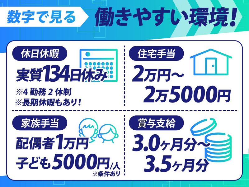 仕事内容 せっかくなら、未来の自分に誇れる仕事を。 ★ 国内トップクラスのリサイクル技術 ★ 【未経験歓迎】異業種からの転職者活躍! 【安心の待遇】家族・住宅手当など充実♪ 実質年間134日休み!年4回の長期休暇あり This position requires Japanese Language Proficiency Test Level N1 or higher. - 【仕事内容】 - ■大型機械のオペレーター業務 ■フォークリフトでの原料運搬作業 ■消耗部品の定期交換、メンテナンス ✨複数人作業だから製造未経験でも安心✨ 分からないことがあればすぐに質問できる! 製造職・正社員デビューも大歓迎♪ <作業の流れ> ①プラスチック廃材などの原料を 原料置き場から機械の前まで運搬 (フォークリフト使用) ➁ボタン操作で機械と関連設備を稼働 ③原料を手作業で選別し機械へ投入 ④設備の運転状況を目視で監視 ⑤製品が満杯になったら、 フォークリフトで交換 ⑥出来上がった製品を計量後、 荷札および作業日報に記入 ⑦計量後製品を所定の置き場まで運搬 ※原料の加工が終了するまで 、 ③~⑦を繰り返します。 ※作業人数:1人~3人 (原料により作業人数変更あり) ⭐関わった原料はこんな製品に! ・各種容器 ・高機能繊維 ・食品トレー ・海外有名サッカークラブチームの ユニフォーム原料 など - 当社について - あらゆるプラスチック樹脂をリサイクルし 用途別に原料を生み出す、 高度なリサイクル技術で エコな社会の実現を目指しています。 *・~・*・~・*・~・*・~・*・~・*・~・* 技術開発力を認められ国内だけではなく 世界からも取材依頼が殺到(年間30件) *・~・*・~・*・~・*・~・*・~・*・~・* <ホームページ>http://kyoei-rg.co.jp/