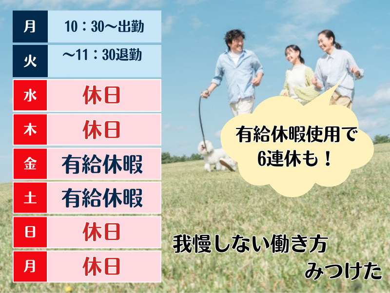 固定時間制 勤務時間詳細 総労働時間:1ヶ月あたり138時間15分 〜 158時間 10:30~翌11:30(実働時間19時間45分) (休憩5時間15分あり ▶仮眠3時間、1時間×2回=2時間、朝15分×1回) 実働は1回約20時間ですが、休憩・仮眠はしっかり5時間以上。 勤務は週2回なので、 まとまった自由時間がたっぷりとれる、 「メリハリある働き方」ができます。 ~1日の流れの一例~ 10:30:出勤・制服に着替える 11:00:朝礼・引継ぎ・予約数の確認など 15:00:チェックイン対応・フロント対応 24:00:仮眠(3時間仮眠+2時間15分休憩) 8:30:チェックアウト対応・引継ぎ 11:30:退勤