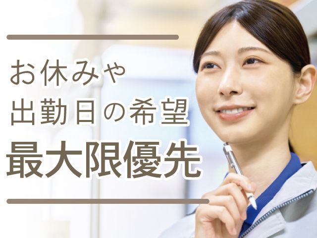 仕事内容 お休みは、自分で1ヶ月前に 申告して設定となります。 土日休みもOK、平日休みもOK! ご都合に合わせて勤務いただけますよ! お休みのご希望は最大限尊重いたします。 20代、30代、40代、50代 中高年世代までの女性活躍中! 主婦(夫)、主婦パートさんも、 即日スタートもOK! ▼仕事内容について 宇都宮市平出工業団地内の工場で、 大手車メーカー部品の 加工や目視検査のほか、 組立作業・シール貼り作業など 軽作業もお願いします。 難しい作業ではありませんので すぐに作業を覚えることができます。 ※細かい傷も見るため多少視力を要します。 工場ワークデビューの方も大歓迎です 以前に製造・組立・検査・仕分け・ ピッキング・梱包などの何かしらの工場や 倉庫での就業経験をお持ちの方であれば、 経験を活かせるのでスムーズに お仕事スタートしやすいです ▼おすすめポイント 土日休みもOK、平日休みもOK (自己申告制) 女性活躍中 随時見学OK 日払いOK ▼履歴書も証明写真も不要 ご応募からお仕事スタートまでスピード対応! 「履歴書」「証明写真」などの 書類・諸証明のご用意は一切必要ありませんので、 面接前の費用の負担もありません。 履歴書の代わりに、 簡単な面接シートをご用意しておりますので、 面接時に記入いただきます。 顔写真については、 弊社にて用意したデジカメで 撮影させていただきます。 出張面接も対応致します お電話でのお問い合わせは 028-612-8611までお願い致します