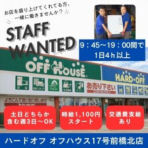 インフォメーション \9:45~19:00間で1日4h以上、週3日以上の勤務/ 体を動かして働くリユースショップスタッフ募集!正社員登用制度もあり、パートアルバイトから社員への道も可能! ★17号前橋北店取扱商品★ オーディオ・液晶テレビ・ブルーレイ パソコン・タブレット・デジカメ・工具 楽器・ゲーム機・スマートホン・カーナビ ゲームソフト・フィギュア、 ブランド品、金・プラチナジュエリー、 腕時計、バック、家具や生活雑貨、生活家電、 スポーツ・アウトドア用品など 今までに見た事ないような商品に巡り合える そんな楽しさがあります★ ・社員3名、パートアルバイト9名の12名 ・20代、30代、40代 ・学生さん、フリーターさん、 ハードオフ・オフハウス17号前橋北店は 株式会社ヌマニウコーポレーションの運営店舗です。 アピールポイント ※この求人は急募のお仕事です。 自分力バロメータ コミュニケーション力 協調性 積極性