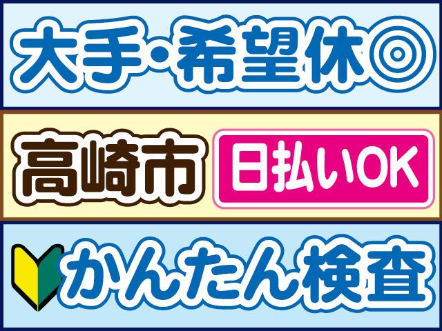 仕事内容 大手企業で安定・未経験者OKで高時給 急募案件のため、即見学OK 【アイスの検査のおすすめポイント】 〇未経験OK、カンタンな作業 〇長期で働ける 〇日曜定休ほか、希望休OK 〇高時給1270円スタート 〇冷暖房完備で快適 〇髪型自由 〇20代30代40代の男女活躍中 〇履歴書不要 〇日払いOK(規定内) 〇交通費支給(規定内) 【アイスの検査の仕事内容について】 高崎市新町の食品工場でのかんたん作業 具体的には アイスクリームの検査作業 を お願いします。 ラインで流れてくるカップアイスを異物がないか、 漏れがないかを見ていただきます。 難しい作業はないので未経験の方でも安心 職場見学(30分~1時間程度)を実施しております。 【勤務について】 ・早番・日勤・夜勤から固定勤務※選べます (実働8時間) ・土日祝休みの週休2日制 急な発熱・体調不良・冠婚葬祭など、 突発的なお休みに柔軟に対応しております。 【こんな経験活かせます!】 下記経験者は前職活かせます。 〇食品製造作業パート・アルバイト 〇食品工場パート・アルバイト 〇検査・検品パート・アルバイト 〇主婦(夫)パート 前職不問で採用しております。 ブランクOK、お気軽にご連絡ください。 〇ご不明な点はお気軽にお問い合わせください〇 お電話でのご応募、ご質問も受付中! 株式会社ロフティー 高崎支店 TEL0800-222-6888(フリーダイヤル) お仕事情報など 採用ページはこちらから https://entori.jp/loftygunma