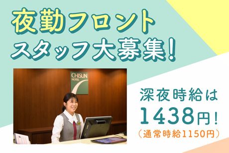 【夜勤専属のフロントSTAFF】22‐翌5時は時給1438円/週3日~OK/明るい対応ができる方歓迎