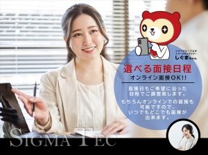 選考について [1]応募画面より必要事項を入力して 送信して下さい。 確認後折り返しご連絡し、 採用担当者との面接を セッティングさせて頂きます。 [2]お電話にてご応募下さい。 1.応募 ↓ 2.面接(リモート面接・電話面接もOK! ↓ 場所と日時はお気軽にご相談下さい) 3.採用 ↓ 4.職場見学(見学してから最終決断でOK) ↓ 5.勤務開始 応募について 【応募方法】 1『WEB応募』より応募フォームに必要事項を入力して送信して下さい。 確認後、折り返しご連絡し、採用担当者との面接をセッティングさせて頂きます。 2 お電話にてご応募下さい。 ※電話でのご応募・ご質問は「採用ページを見ました。」とお伝えいただくとスムーズです。 【応募先企業名】 株式会社シグマテック 川越事業所 【応募先担当者】 採用担当 【応募先住所】 埼玉県川越市脇田本町11-1 川越シティビル4F 【応募先・最寄駅】 JR川越線 川越駅 徒歩3分