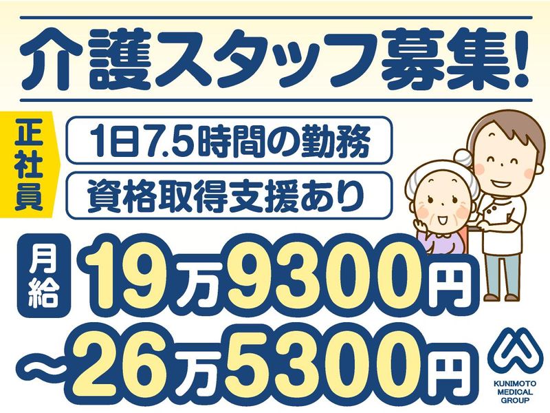 【保険制度】 雇用保険、労災保険、健康保険、厚生年金 待遇・福利厚生 【福利厚生】 ◆昇給あり(年1回) ◆賞与あり(年2回:昨年度実績2.2ヶ月分) ※処遇改善加算の配分と業績により初年度より算定期間の月割りで支給 ※満額支給は2年目以降が対象 ◆退職金制度(毎月払い制度) ◆65歳定年制 ◆再雇用あり※70歳まで ◆交通費支給(上限5万円/月) ◆無料駐車場完備・車通勤可 ◆ユニフォーム貸与 ◆医療費補助制度 (グループ医療機関受診の場合) ◆資格取得支援制度あり ◆奨学金制度あり ┈┈┈┈┈ ୨୧ ┈┈┈┈┈ \キャリアプランも豊富/ 北海道を中心に医療・看護・介護事業を 展開している【くにもとグループ】! グループ内でのキャリアチェンジなど 長く働ける環境が揃っています!