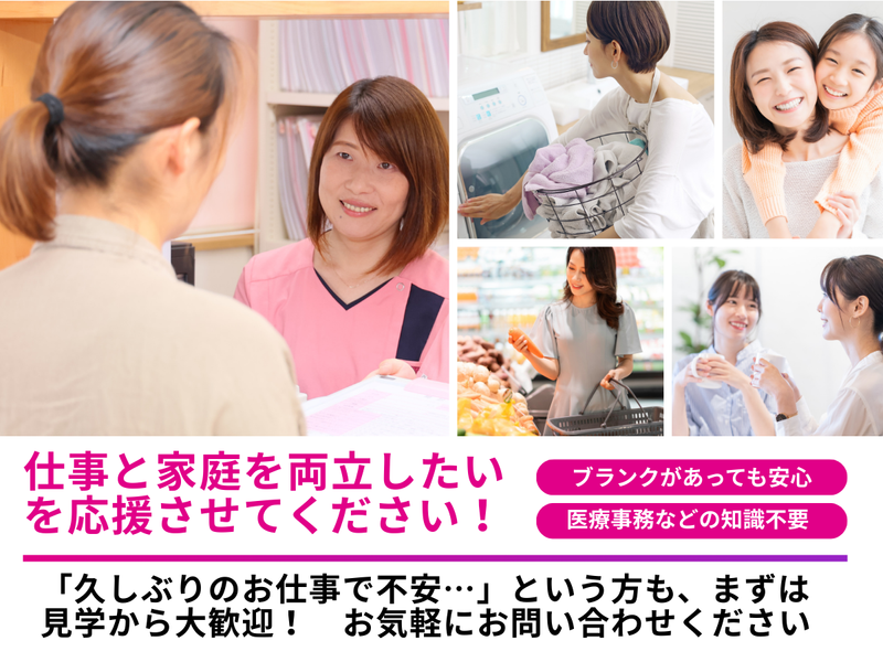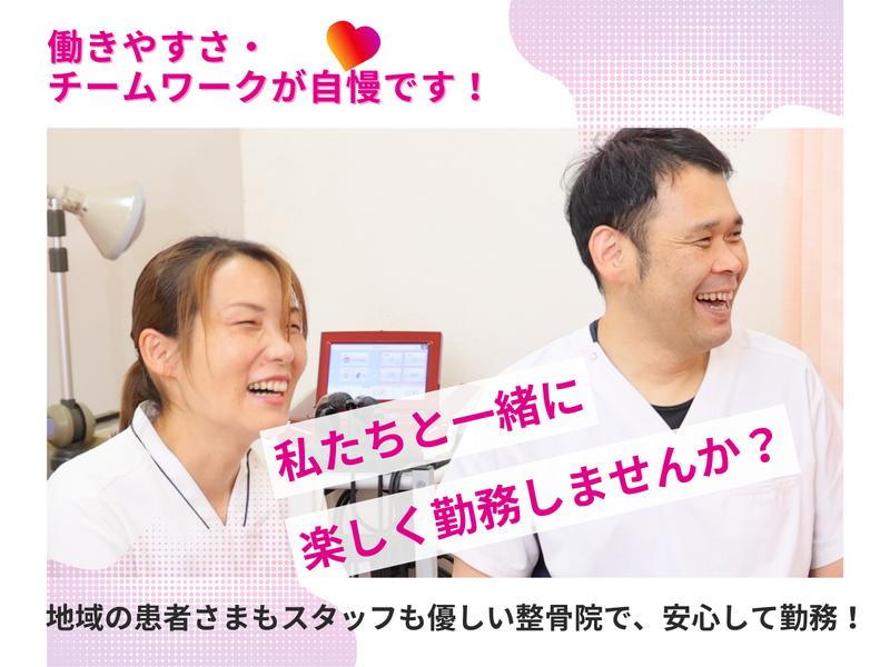 求めている人材 ✅簡単なPC入力、電話応対、LINE入力ができる方 ✅患者様を笑顔で接遇出来る方 ※午前診と午後診共に勤務可能な方を募集 (1日5時間程度の勤務) ※週3日程度勤務出来る方(勤務日数は相談可) ★フリーター・主婦さんも活躍中 ★Wワーク・扶養内勤務にも◎ 【 下記のような方も歓迎 】 ・病院や診療所、クリニックで医療事務や受付スタッフの経験がある方 ・整骨院や接骨院などでの勤務経験がある方 *…*…*…*…*…*…*…*…*…* <スタッフAさんにインタビュー> 受付のお仕事は予約や会計だけじゃない!? 患者様と楽しくお話ししながら、 ホッとできる時間をつくる大切な役割です。 スタッフ同士も仲良しで 協力し合える雰囲気◎ 未経験でも安心してスタートできる環境! 「人と話すことが好き」「笑顔で働きたい」 そんな方にピッタリです♪
