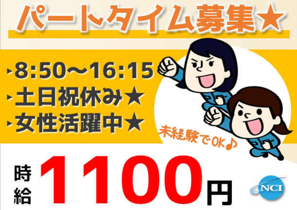 PR・職場情報 =====ここがポイント===== ■人気!工場内軽作業! ■未経験・チャレンジスタート歓迎! ■土日休み! ■年齢不問!男女スタッフ活躍中! ==================== ▼安心のフォロー体制▼ 就業してからも当社営業スタッフがしっかりフォローしますので、派遣が初めての方や未経験のお仕事に不安のある方も安心してお勤めいただけます!! 20代~50代の年代の方が大活躍中!お仕事内容の問い合わせだけでもお気軽にどうぞ! 求人の特徴 【お仕事開始までの流れ】 STEP1: 営業社員との面談、登録 STEP2: 職場見学 STEP3: 入社書類取り交わし STEP4: お仕事開始 ※平日18時以降の面談やオンライン対応も可能です。ご希望の方は遠慮なくお問い合わせください! - この求人以外に派遣・バイト・アルバイト・パートや軽作業、製造、事務 のお仕事に興味のある方、短時間、短期・長期歓迎です。 上越市、糸魚川市、妙高市でお仕事をお探しの方、 未経験、ハローワークでお探しの方もお問い合わせください。 - 〒943-0805 新潟県上越市木田2丁目1番1号 7F-2 株式会社 NCI 上越支店 T E L:025-530-7272 F A X:025-530-7283 freedial:0120-62-2011 (※お電話にてご応募の際は「求人サイトを見て」とお伝えください!) 一般労働者派遣事業許可番号:派07-300732 職業紹介事業許可番号:07-ユ-300310 kyo 求人ポイント 交通費支給,即日勤務OK,長期,フリーター歓迎,バイク通勤OK,給料前払いOK,学歴不問,車通勤OK,平日のみOK,転勤なし,未経験者歓迎,リモート面接OK,研修あり,社会保険完備,制服貸与,育休制度あり,家庭都合休OK,禁煙・分煙,長期休暇あり,産休制度あり,産休・育休取得実績あり,固定時間制