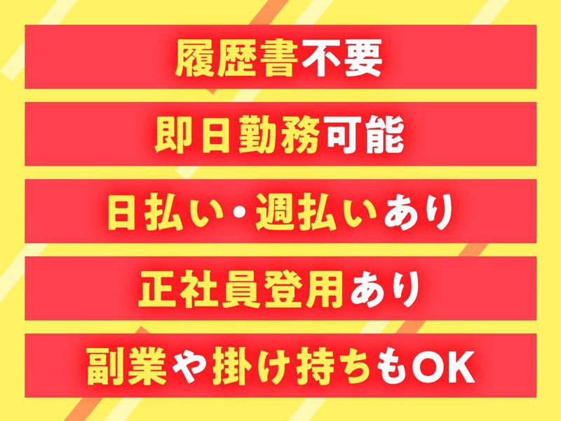 【保険制度】 雇用保険、労災保険、健康保険、厚生年金 待遇・福利厚生 【福利厚生】 ・交通費規定支給(1日1,000円まで) ・制服貸与 ・無期雇用転換交渉制度あり ・時間外手当 ・休日出勤手当 ・バイク通勤OK ・日払い・週払い制度あり ・屋内全面禁煙