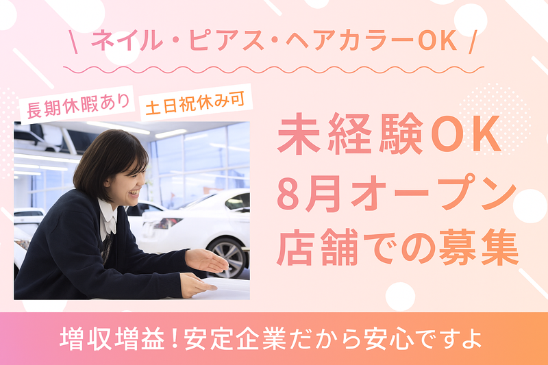 求めている人材 ✅ 必須条件 ✅ ◆Excel・Wordなどの基本操作スキル ◆普通自動車免許をお持ちの方 └ 車の移動があるため ⭐ 学歴・経験・ブランク不問 ⭐長く働ける方歓迎! ⭐クルマの知識がなくても問題なし! 人と接するのが好きで、 基本的なPC操作ができればOKです。 久しぶりにお仕事復帰する方もOK 家庭・育児に理解のある仲間が 揃っているので 安心して働けます! 年齢の条件と理由:あり(例外事由1号・65歳未満(定年のため))