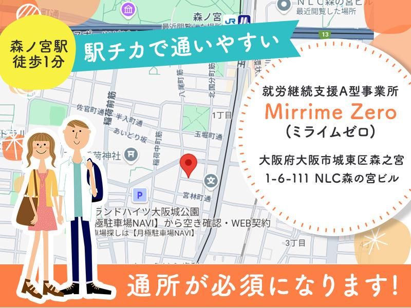 選考プロセス 【選考について】 見学⇒面談(1回)⇒採用 ※見学と面談の同時OK! 応募⽅法は下記よりお選びください! 【簡単応募】 応募ボタンから24時間受付中! 名前やメールアドレスなど 数項⽬の⼊⼒のみで応募完了! 面談⽇時については、 後ほど担当者よりご連絡いたします。 【お電話での応募】 いち早くお話をお聞きしたい⽅は、 下記へお電話ください! TEL:06-6718-7318 採⽤担当宛 ※就労継続支援A型事業所Mirrime zer0は株式会社JOBconnectが 運営している事業所です。 【面接地・登録地】 就労継続支援A型事業所Mirrime zer0 所在地:大阪府大阪市中央区森ノ宮中央2-5-15 フジアドバンスビル3階 電話番号:0667187318 メールアドレス:info-mirrime-zero@jobconnect.jp 森ノ宮駅から徒歩5分 ※今年8月に移転したばかりの新オフィスとなります!