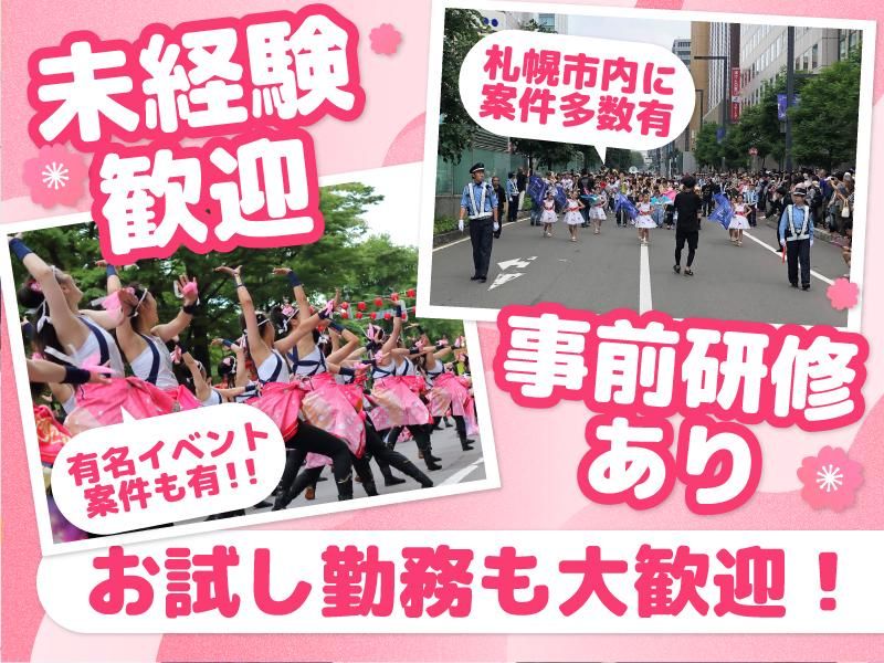 仕事内容 / 応募資格は「18歳以上」であること!(警備業法第14条の為) 事前の法定研修があるから未経験や60代・70代も活躍中! \ *ー* 新しい案件(現場)も続々増えています! 警備スタッフさんを新たに募集するにあたり、 制服もリニューアルしちゃいました!! 札幌市内でたくさんのお仕事をご案内可能! 超有名大人気アイドルのコンサートや YOSAKOI、プロスポーツイベント、 札幌マラソンやさっぽろ雪まつり・・・などなど! 直行直帰OKなので、自宅から通いやすいエリアで お仕事ができますよ! *ー* 【具体的なお仕事は・・・】 *来場者のご案内・誘導、見回り(巡回) *関係者通路での受付(出入管理) *イベントや店舗の駐車場内での車の誘導 など! *業務内容はイベントによって異なります >1番最初にするお仕事は・・・ まずは法律で定められた 研修を受けていただきます! そのため、警備未経験でも しっかりとお仕事を覚えられます。 もちろん研修中もお給料は発生! 慣れるまでは先輩や責任者が 一緒に同じ現場に行ってくれるので わからないことがあればスグに聞けますよ! *警備経験者・雑踏警備資格保持者も歓迎! >雑踏警備資格手当有(2級5000円/1級1万円) >現場は・・・ 中央区など、札幌市内全域に多数あり! (最寄り:札幌駅/大通駅/すすきの駅など) 交通費は全額支給なので、ご安心ください。 通いやすいエリアのお仕事をご案内できるので、 勤務地に関してはお気軽にご相談ください! 基本的に現場へは直行直帰のため、 お仕事が終われば即帰宅! 春も夏もイベントが盛りだくさん! 1年を通して人気イベントに携われるお仕事ですよ! 【勤務地例】 *北海きたえーる *真駒内セキスイハイムアイスアリーナ *大和ハウス プレミストドーム(旧札幌ドーム) ・・・等! その他にも札幌市内で様々な案件があります! 現場へは直行直帰OK! >暑さ・寒さ対策もバッチリです。 夏は暑さ対策として空調服と水分補給用のお水、 塩分補給用のタブレットを支給します。 >制服がリニューアルしました! 「速乾素材のポロシャツ」仕様の制服を新たに導入! 動きやすく空気の通りも良いので暑くても快適に働けます! デザインにもこだわり、オシャレでカッコいいと評判です✨