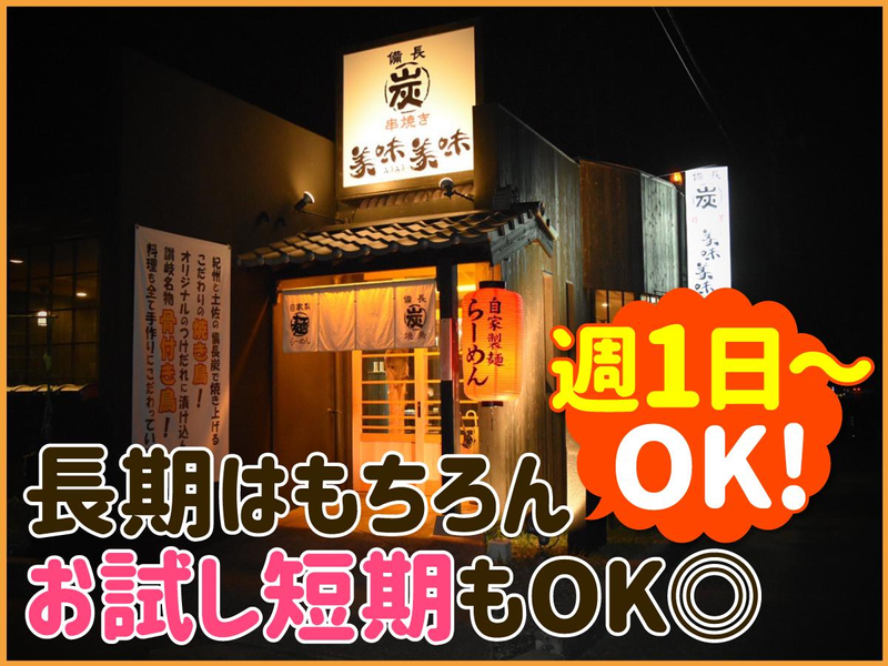 仕事内容 ・―・―・―・―・―・―・―・―・―・・―・―・―・ ★髪型・髪色・ピアス自由でおしゃれに♪ ★シフト自由!週1~Wワークや短期も◎ ★未経験者OK!先輩が丁寧にサポート! ・―・―・―・―・―・―・―・―・―・・―・―・―・ 【具体的なお仕事は?】 接客と簡単な調理補助をお願いします ・お席のご案内 ・料理の配膳、下膳 ・お皿洗い ・料理の盛り付け ・片付け など。まずは 「○番テーブルにこれ持ってって~!」 など簡単なことからスタート◎ 注文はタッチパネルでオーダー取りはなし! 先輩スタッフが一から丁寧に教えていくので 安心してくださいね! - \こんなお店です/ 掘りごたつもある落ちついた雰囲気のお店。 23年継ぎ足しの秘伝タレに、 土佐備長炭で焼きあげる オリーブ地鶏の焼き鳥と骨付鳥が自慢◎ \スタッフの働きごこち最重視/ ◎マスターが腕を振るう絶品まかないあり! リクエストもOK♪ ◎スタッフ同士はもちろん、 店長や社長ともコミュニケーション活発。 なんでも相談しやすい雰囲気です! ◎ホールだけ、仕込みだけ、洗い物だけ、 など専属勤務もお気軽にご相談ください。 また、料理はすべて手作りなので お好きな方はキッチンメインの勤務も可! 自炊料理にも磨きがかかるかも?! -