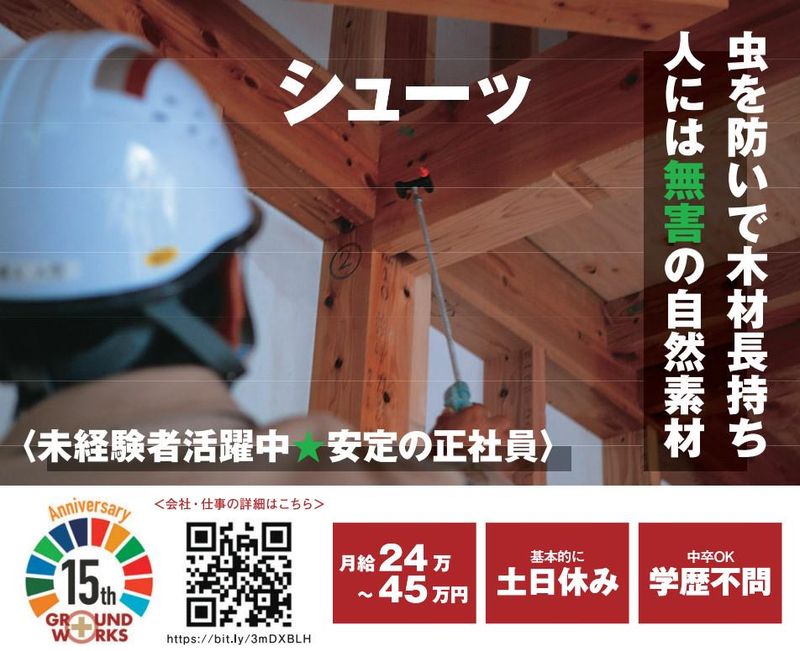 仕事内容 ✅スキルや頑張りによってステップアップ ✅安定の正社員募集!未経験OK! ✅研修制度も充実!昇給・賞与あり お電話応募も大歓迎! 【TEL】0538-45-3313 建築現場でのホウ酸処理をおこないます。 ✨シロアリ対策、それは ✨「住宅のアンチエイジング」! ✨快適な家造りをサポートするプロへ! ■普段目に見えない家の土台、柱、梁などの 構造材の腐れやシロアリ被害を 防ぐための木材劣化対策をお願いします。 ■具体的なお仕事は… 自然素材で害がほぼなく効果も非常に長い為 安心とされる「ホウ酸」を使用した 木材劣化対策をお願いします。 ■作業の流れ (基本1日1現場、2人で作業します) 1. 朝、現場に到着後、片付け・掃除 *作業をしやすくするだけでなく、 同じ現場で働く大工さんや 他の業者さんも気持ち良く仕事が できるようにします。 ※現場は袋井、浜松など。 場合によっては直行直帰も可能です。 ↓ 2. ホウ酸を塗ってはいけない場所に養生 *大工さんの大事な道具にも養生を行います。 ↓ 3. ホウ酸処理作業 *作業は簡単ですが、 塗り忘れがないように注意します。 ↓ 4. 会社に戻り、片付け、翌日の準備、退社 ■教育体制も充実しています。 選び抜いた材料を使用する際には、 メーカーの研修を受けることができ、 安心して働ける環境を整えています。 もちろん 未経験の方には基礎から丁寧に教えます。 その後、リーダーなど上を目指したい という方の頑張りにも応えます。 経験やスキルがなくても大丈夫です! 【アピールポイント】 ✨グラウンド・ワークスは ✨家造りを裏方で支える ✨プロ集団です! ■グラウンド・ワークスは、 地盤、断熱、シロアリ対策など、 家を建てる上で欠かせない 「基礎」の部分をしっかりサポートします。 これらの工程の質が 家の丈夫さや耐久性に大きく影響することを 誰よりも理解しているからこそ、 私たちは仕事に一切の妥協を許しません。 ■シロアリ対策と言えば、 日本では合成殺虫剤が主流ですが、 効果は3~5年といわれています。 当社では「家にも人にも良い環境」を 提供するため、自然由来の素材である 「ホウ酸」を使用しており 多くのお客様から高い評価を いただいています。 ■現場仕事でも、 汚い・むさ苦しいイメージはありません。 そろいの爽やかなユニフォームを着用し、 現場や道具を常にきれいに保つことを 心がけています。 ■面接前に現場見学を実施します。 見学後に面接に進むかどうかを 判断していただけますので、 まずはお気軽にご応募ください!