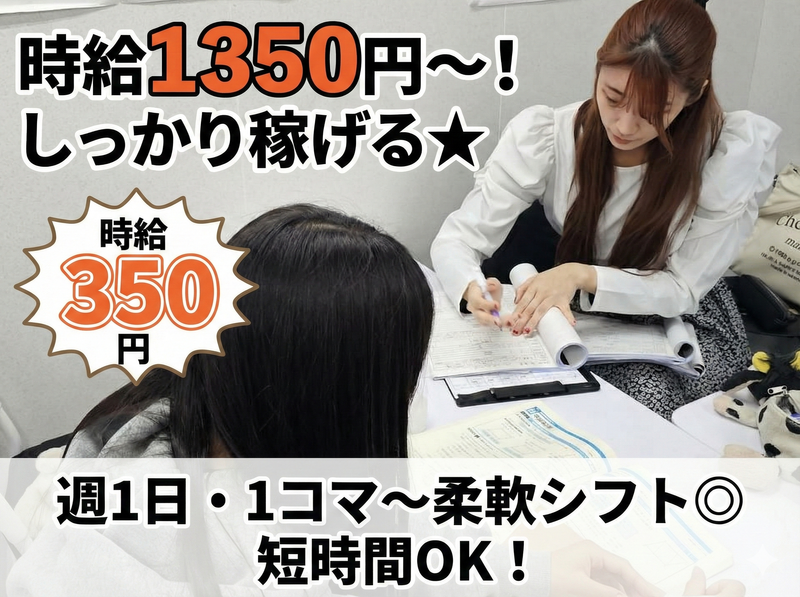 シフト制 勤務時間詳細 [1]16:50〜18:35 [2]19:10〜21:50 ✅火~金曜の間で週1日~OK! ✅1コマ授業で、1日2~5コマで相談OK! ✅平日のみ(希望により土日出勤も追加可能!)