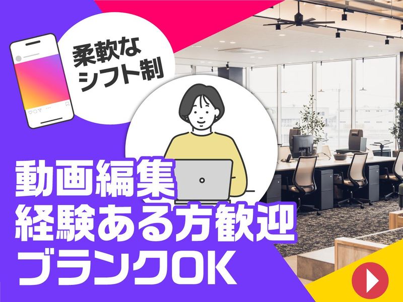 仕事内容 【動画マーケティングで“バズる”を創る!】 SNS広告動画の制作スタッフ募集! 「好き」を仕事に、長く活躍できます♪ ⭐成長意欲を重視! 「成長したい!」という気持ちを何より大切にしています。異業種出身の先輩も多数在籍! ⭐服装・髪型自由! あなたらしさをそのまま活かせます。 ⭐柔軟なシフト制! ライフスタイルに合わせた勤務スケジュールが可能です! [具体的には] ■TikTokやYouTubeに掲載するショート動画広告の編集・制作 ■企画アイデア出しや構成 Adobeソフトの使用経験があれば、動画編集スキルは問題なし! SNSを日常的に活用している方であれば、スムーズに業務に馴染めます◎ <こんな方にピッタリ!> ◆SNSを日常的に活用している方 ◆広告・マーケティング業界に興味のある方 ◆学び続ける意欲がある方 ◆「面白い」を形にしたい方 <スキルアップ支援も充実!> 映像スクールの受講費は会社が全額負担! 資格取得支援制度あり◎