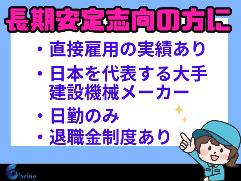仕事内容 ━━━━━━━━━━━━━━ 毎日16:45に確実に帰れる ━━━━━━━━━━━━━━ 残業は少なめ。 日勤のみ・土日祝休み固定。 プライベートの予定が 先に立てられる職場です。 ━━━━━━━━━━━━━━ 月収29万円以上を実現 ━━━━━━━━━━━━━━ 時給は研修初日から変動なし。 給料前払い・週払いにも対応。 手元に入るタイミングも選べます。 ━━━━━━━━━━━━━━ 大手メーカーで長く安定して働ける ━━━━━━━━━━━━━━ 日本を代表する建設機械メーカーの 工場でのお仕事です。 直接雇用への実績もあり。 長期で腰を据えて働けます。 ━━━━━━━━━━━━━━ 仕事内容 ━━━━━━━━━━━━━━ ショベルカーなど 建設機械の部品ピッキング。 指示書を見ながら部品を取り出し、 仕分けして各ラインに台車で運ぶ。 手順は決まっているため 自分のペースで進められます。 多種類の部品があるため 単調になりすぎない作業量です。 ━━━━━━━━━━━━━━ 未経験でも1か月で独り立ち ━━━━━━━━━━━━━━ 初日:わかりやすい座学研修 2日目以降:現場でOJT 専任の担当者がマンツーマンで サポートするため質問しやすい。 研修中も給与は変わりません。 ━━━━━━━━━━━━━━ 職場環境・待遇 ━━━━━━━━━━━━━━ 無料の寮を完備 (家電レンタルも可能) 食堂・コンビニ・シャワー室あり。 給料前払い・週払いOK。