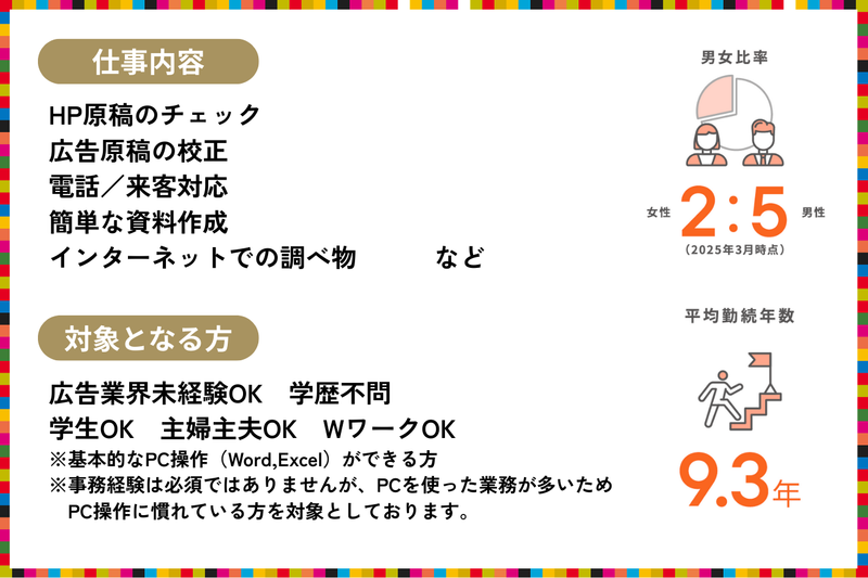 求めている人材 基本的なPC操作(Word,Excel)ができる方 ※事務経験は必須ではありませんが、PCを使った業務が多いため、PC操作に慣れている方を対象としております。 広告業界未経験OK 学歴不問 学生OK 主婦主夫OK