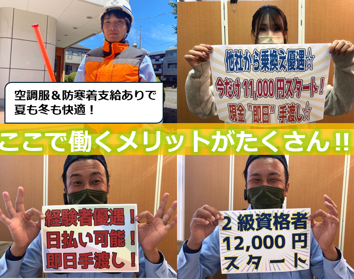 勤務時間詳細 実働時間:1日あたり8時間 平均勤務日数:1ヶ月あたり4日 〜 20日 日勤:8:00~17:00 夜勤:20:00~翌5:00 (他、現場により時間変多数あり) 週1日~応相談! アルバイトさんは週1日から勤務可能! 「学業と両立しながら働きたい」「自分の時間も大切にしたい」 「フルタイムで安定した収入がほしい」 どなたも希望に合った働き方が可能♪ ★研修制度があるので未経験の方でも安心して下さい☆ 【日勤】 2級資格日勤1万2000円スタート! [平日]日給1万1000円 [日祝]日給1万4850円 【夜勤】 [平日]日給1万3750円 [日祝]日給1万8560円 «月収例» [日祝夜勤×4回+平日夜勤×1回の場合] (日給1万8560円×4回)+(日給1万3750円)=【8万7990円】 [平日日勤×10回の場合] 日給1万1000円×10回=【11万円】 <メリットたくさん!> 日払い・寮完備! 防寒着や制服・装備一式貸与! <交通誘導警備員> 長期で働ける方大歓迎。 学生さんやシニア世代まで幅広い年代の方が活躍中。 交通費全額支給なので遠方からの通勤も安心。 案件によっては夜勤もあるので稼げます。