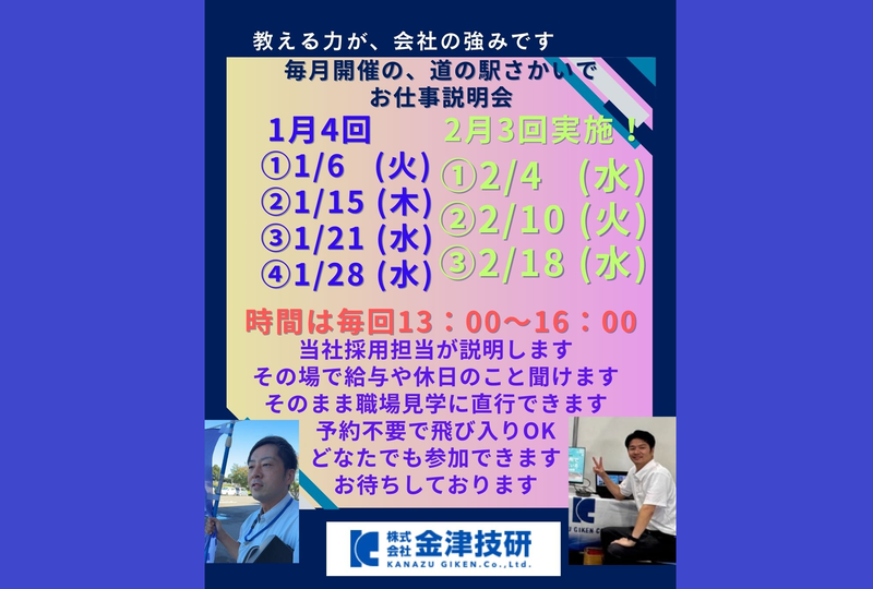 アピールポイント: ★金津技研の準社員が選ばれる理由 ・固定給なので、生活が安定する ・固定給なので、色々な支払いの目途が立てられる ・賞与があるのが嬉しい ・安心して仕事に取り組める! ★福井県の企業ではNo.1の人数規模で製造請負事業をおこなっている会社です。 ★教える力が、会社の強みです。 ★仕事の教え方研修TWI-JIを受けた社員たちがいます。 ★新人を放っておかない文化があります ★わからないを、放置しない ★正社員の離職率1%という低さが自慢の働きやすい会社です ★当社はみんなの和を乱す人でなければ即採用します - -