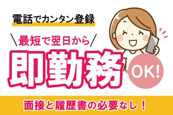選考フロー ▼▼履歴書不要!最短3日で勤務開始▼▼ このままネットから、もしくは電話応募も歓迎! ※「電話でのユーザー登録」が完了しませんと、ご応募頂いたお仕事がご紹介できません。 ①:【電話にてユーザー登録】 0120-445-101よりお電話を差し上げます。 ※事前の番号登録をお願い致します。 ※プロフィール確認のみの為、事前準備一切不要! ②【担当者と面談(15分程度)】 仕事内容・勤務先をご案内します。 ③【お仕事スタート】 事前の職場見学を行い、条件が合えば最短翌日から勤務開始OK!
