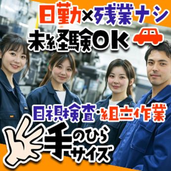仕事内容 仕事内容 / 未経験からもできる製造業務 \ 制服貸与で冷暖房完備の業務だから作業が快適!!! たくさんの女性が活躍中の職場です / お仕事内容 \ 車載製品の製造ライン 手のひらサイズの車載製品の目視検査・組立業務 作業が細かくなるので、手先が器用方におすすめです。 / 職場見学は随時実施しております \ 気になるおしごとの様子や職場の雰囲気… まずはわたしたちと一緒に 『職場見学』に行ってみましょう! あなたの担当者が 見学中もしっかりサポートいたしますので 安心してくださいね 女性も活用してる職場で、 子育て中の方もたくさんいます!! おすすめポイント! >日払い/週払いOK< 最短翌日受け取り コレで急な出費があっても困りません >おすすめポイント!< ・年間休日125日以上 ・日勤&1シフトのみ! ・マイカー通勤OK! ・交通費支給! ・男女スタッフ活躍中! ・残業なし! ・経験・学歴不問 ・1コインで食べれる社員食堂と売店あり! >こんな方におススメです!< ・未経験スタートOKな仕事を探している方 ・手先が器用でルーティンワークを行いたい方 ・ものづくりが好きな方、得意な方 ・日勤固定のお仕事を探されている方 ・決まった時間で働きたい方 わからないことがあれば何でもお気軽にお問い合わせください 弊社スタッフがフォローさせていただきます!