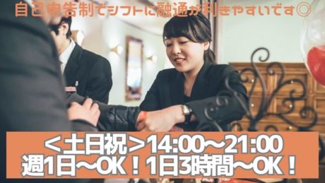 シフト制 勤務時間 ・勤務曜日:土・日・祝 ・勤務時間: [1] 14:00~21:00 週1日以上、1日3時間以上の自己申告制でシフトに融通が利きやすいです◎ 二次会の開催時間によって勤務時間が変動することがあります。