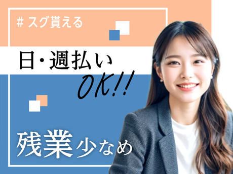 【保険制度】 雇用保険、労災保険、健康保険、厚生年金 待遇・福利厚生 【福利厚生】 ☆嬉しいメリット☆  ̄ ̄ ̄ ̄ ̄ ̄ ̄ ̄ ̄ ■日払い&週払いOK ■ 交通費一部支給 ■ 社会保険完備 ■ 健康診断あり ■ 社員登用制度あり ■ 履歴書不要 ―――――――――――――――― [★]働きやすい環境が整っています! ―――――――――――――――― ・オフィスカジュアルでラクなスタイル♪ ・仕事とプライベートのメリハリ◎ ・長期で安定して働ける環境! ―――――――――――――――― [★]スキルアップも応援! ―――――――――――――――― ・資格取得支援制度あり! ┗「Excel VBA」「MOS Excel」など、 合格すれば試験料を会社負担◎ ・書籍貸出あり!勉強もサポート♪ * * * ◎他にも案件いろいろ! ⇒その他にも、品出し・検品などの軽作業や サンプリング・一般事務などのオシゴトもたく! あなたに合ったお仕事をご紹介します♪ ※屋内原則禁煙(喫煙室あり)