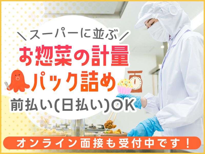 メッセージ 大手スーパーに並ぶお惣菜商品を 製造している食品センターでのお仕事です! 具材の計量やパック詰めといった、 単純な繰り返し作業を担当いただきます。 ▼注目Point!  ̄ ̄ ̄ ̄ ̄ ̄ ̄ ̄ ★お給料の前払い,日払いに対応! ★出勤シフトによっては無料送迎あり! ★オンライン面接(Web面接)受付中です! 久しぶりにお仕事復帰を考えている方や、 未経験から高時給稼ぎたい方におすすめです♪ 幅広い世代の女性が活躍中!時間帯によっては勤務先まで無料送迎で通勤できます♪ 労働者派遣事業(派01-301493)