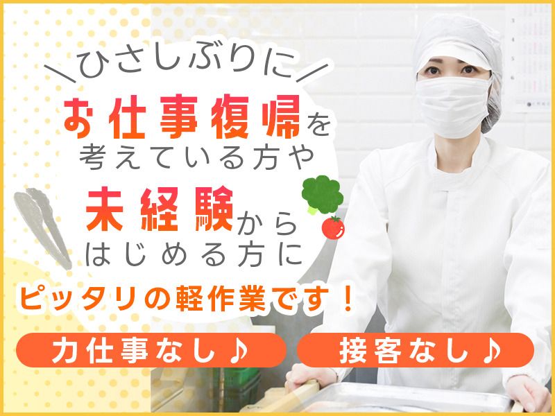 仕事内容 スーパー等に並ぶお惣菜の パック詰め、検品をお願いします! 『具材を◯個盛り付ける』 『計量しながらパック詰めする』 ...などのカンタンな繰り返し作業です◎ ライン作業なので、誰かに急かされることもなく、 一定のリズムで作業に取り組んでいきます♪ 食品工場でのお仕事ですが、 ”包丁で具材を切る”等の調理業務は一切ありません♪ 力仕事も少なめですので、 「体力に自信が無い...」という方でも安心です◎ パートデビュー・未経験STARTの方がほとんどで、 30~60代の女性、主婦さんが活躍中の職場です☆