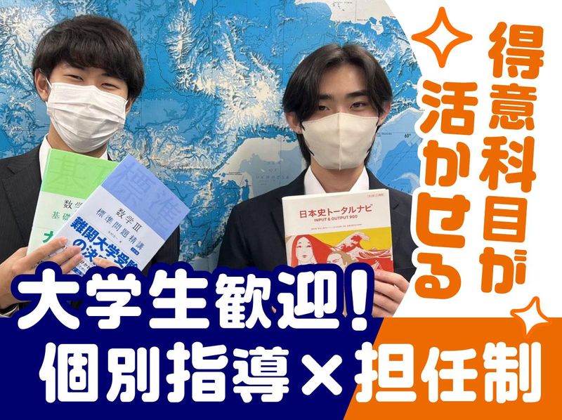 求めている人材 未経験からスタートした先輩も多数活躍中です✨ ⭐未経験・ブランク歓迎!! ・人に教えることが好きな方 ・教育に関わる仕事をしてみたい方 ・大学生・主婦(夫)・社会人、みんな大歓迎! ⭐こんな方にピッタリ! ・人に教えるのが得意、または興味がある方 ・塾講師・家庭教師に興味がある方 ・得意科目(国語・英語・数学・社会・理科など)を活かしたい方 ・子供たちの成長をサポートしたい方 ・教育を通して自分自身も成長したい方 ⭐教育関係を目指している方も歓迎! ・保育士・幼稚園教諭を目指してる方 ・小学校の教員・中学校の教員など教育に携わる仕事を目指してる方 ・高校教諭(高校教師)の経験をお持ちの方 ・中学校教諭(中学校教師)の経験をお持ちの方 ・小学校教諭(小学校教師)の経験をお持ちの方 ⭐教員免許・資格をお持ちの方は優遇! ・教員資格 ・高等学校教諭免許国語 ・小学校教諭免許一種 ・中学校教諭免許理科 ・中学校教諭免許社会 ・中学校教諭免許国語 ・中学校教諭免許一種 ・高等学校教諭免許 ・中学校教諭免許 ・小学校教諭免許 ・高等学校教諭免許理科