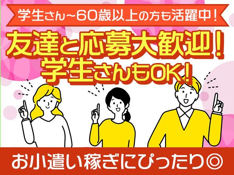 【保険制度】 雇用保険、労災保険、健康保険、厚生年金 待遇・福利厚生 【福利厚生】 ■交通費支給 ■事前研修あり ■単発のお仕事 単発でサクッと働ける! お小遣い稼ぎをしたい学生さんや ちょこっと働きたい中高年の方などに 人気のお仕事です◎ お仕事内容もとってもカンタン★ 事前に研修もあるので 未経験の方も安心してスタート+*